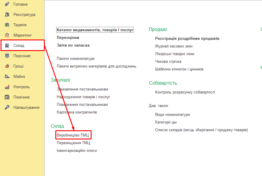 Щоб оформити документ виробництва у програмі, відкриваємо розділ Склад -> Виробництво ТМЦ (Мал. 1)