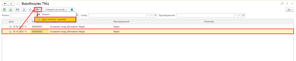Можна надрукувати цінник (або етикетку) на вироблений виріб. Зробити це можна або з самого документа “Виробництво”, або з журналу Виробництво ТМЦ. Обираємо потрібний документ, відкриваємо його (якщо друк з самого документу) , або в самому журналі виділяємо і далі натискаємо на значок “Принтер” і обираємо “Друк етикеток і цінників” (Мал. 11)