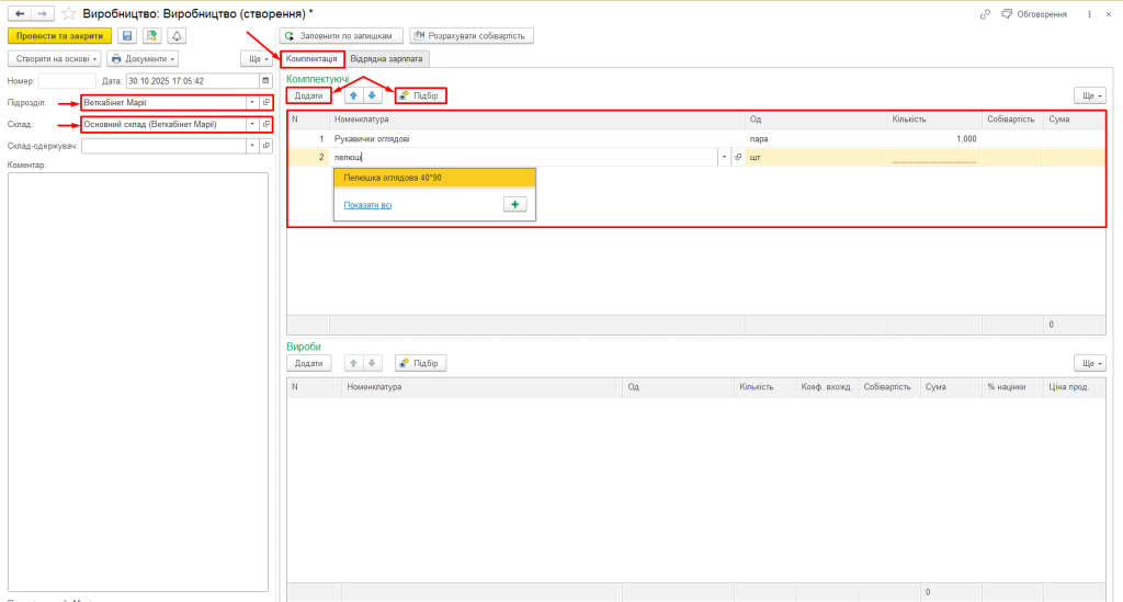 Мал. 3 Заповнюємо комплектацію в документі Виробництво