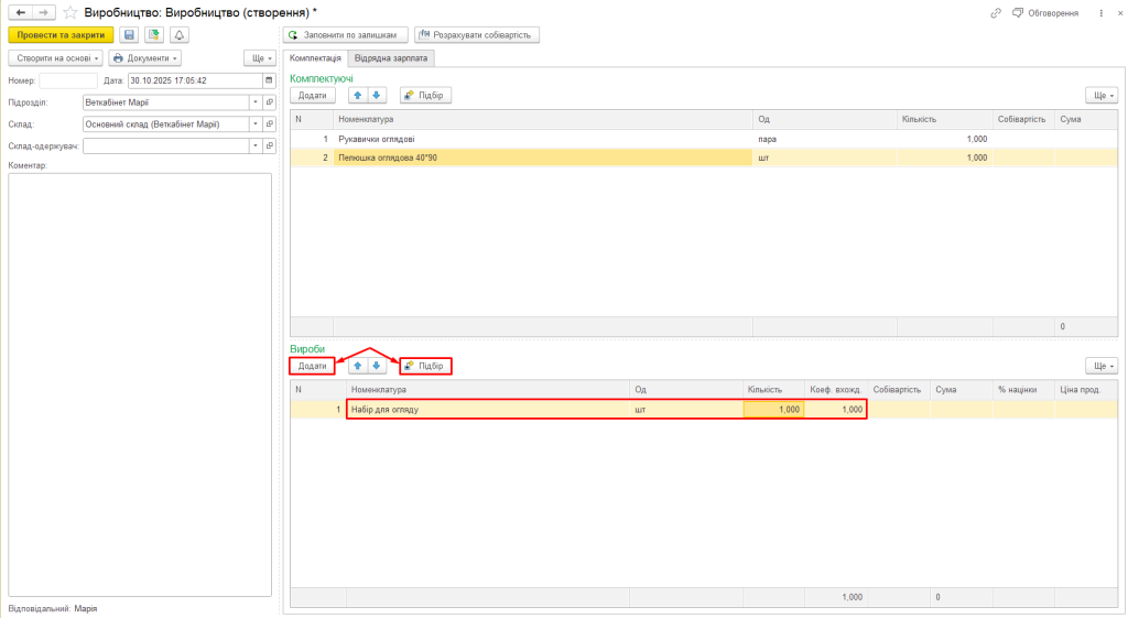 У нижній частині форми заповнення, аналогічним чином додаємо Вироби (готовий продукт), для цього вибираємо позицію з каталогу номенклатури, або створюємо нову, натиснувши на кнопку “Додати” або “Підбір”. Також вказуємо кількість готових виробів (Мал. 4)