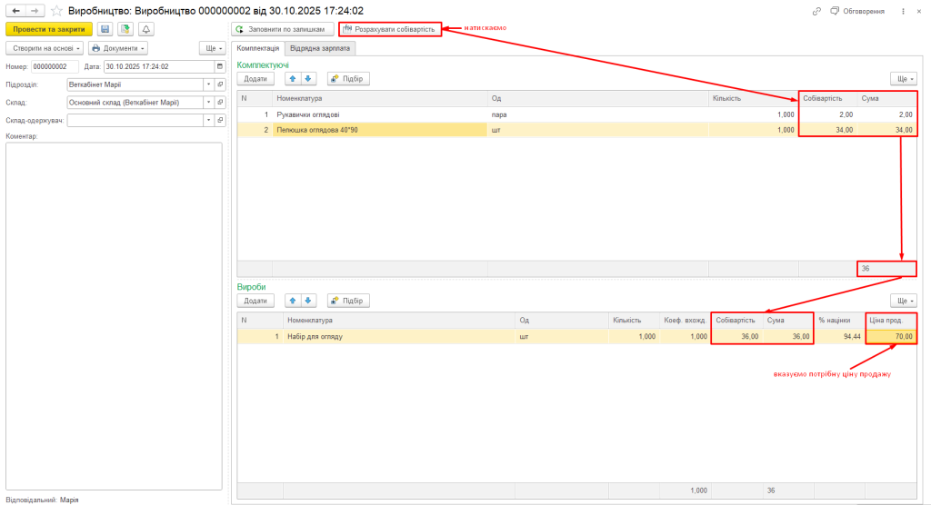 Після заповнення у верхній частині форми натискаємо кнопку “Розрахувати собівартість”. Програма автоматично розраховує та проставляє собівартість на кожну одиницю комплектуючих та виробів, що виробляються, а також суму відповідно до зазначеної кількості. Якщо продажна ціна відповідає бажаної, у документі виробництва можна встановити відсоток націнки чи відразу вказати ціну продажу виробленого вироби (Мал. 5)