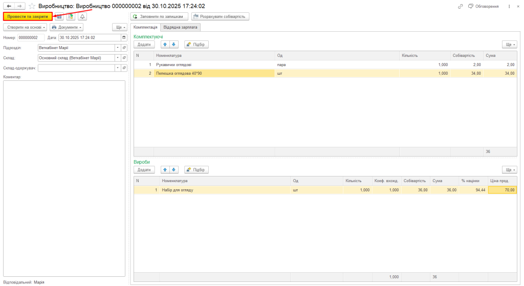 Проводимо документ “Виробництво”, натиснувши кнопку “Провести та закрити” (Мал. 6)