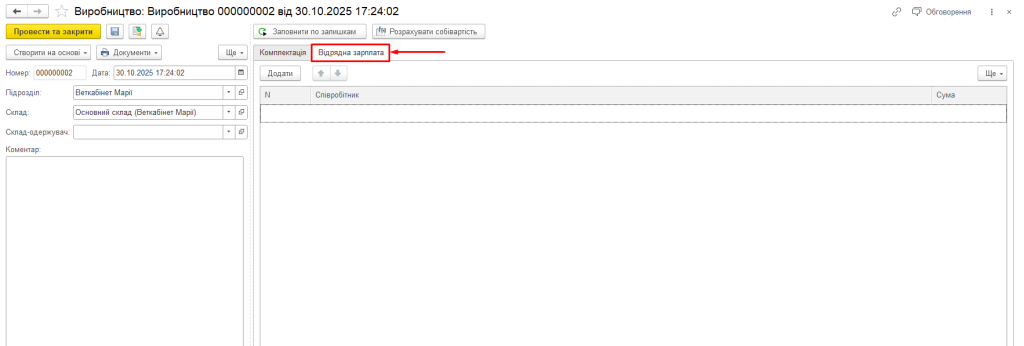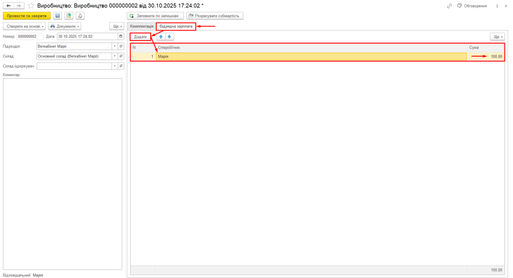 Мал. 8 Додаємо співробітника та суму оплати в документі Виробництво