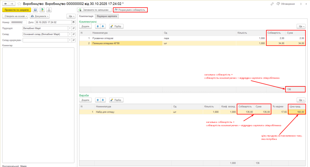 Мал. 5 Розрахунок собівартості в документі Виробництво